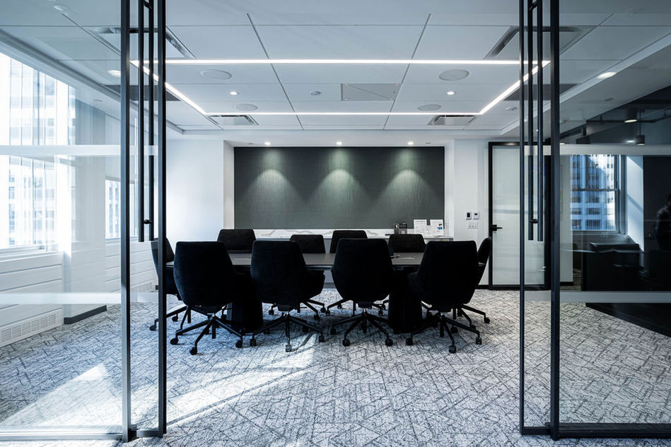 The new pantry and conference space, with corner windows overlooking both Rockefeller Plaza and an expansive Avenue of the Americas, utilizes a large internal sliding door, multiple audio-visual points, and flexible furniture for permeable separation between the various functions.